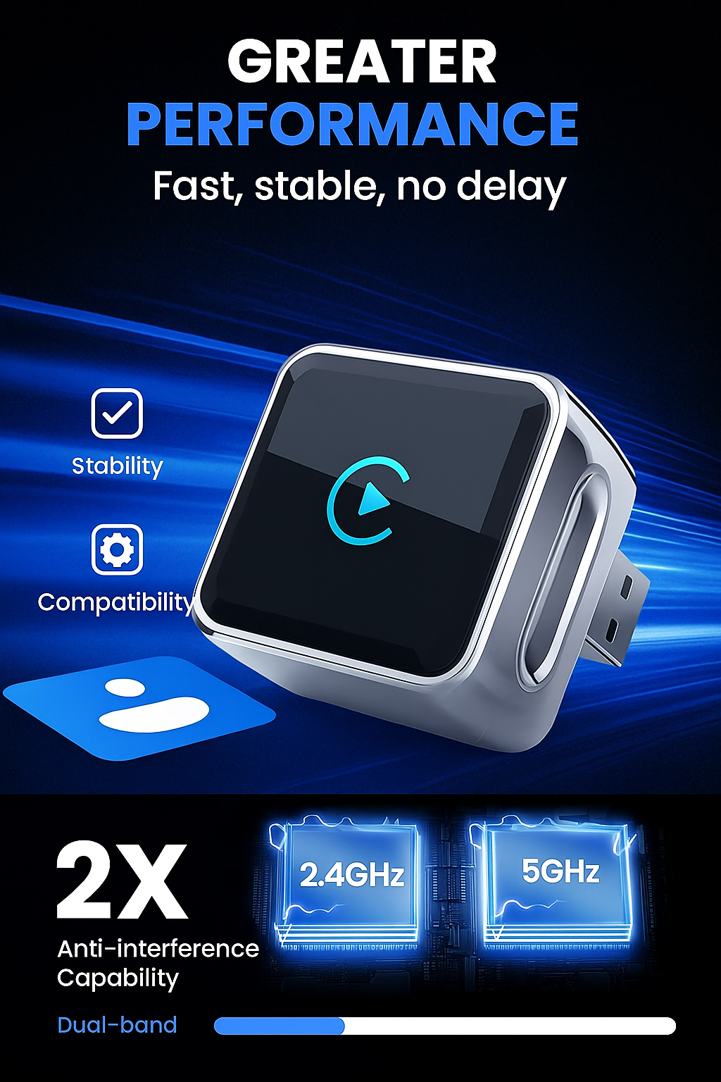 5.8 GHz WiFi & Bluetooth. First connect in 10s, auto-connect in 3s. Up to 3x faster than other adapters.